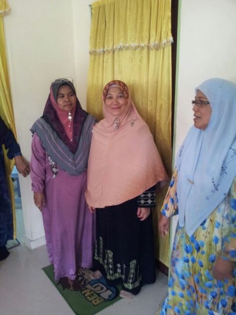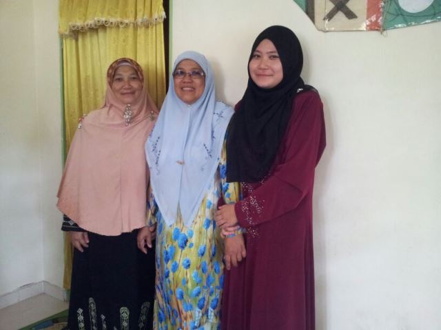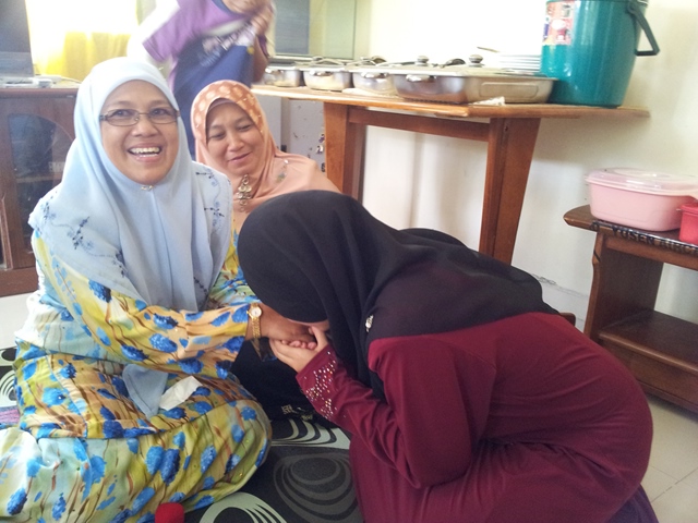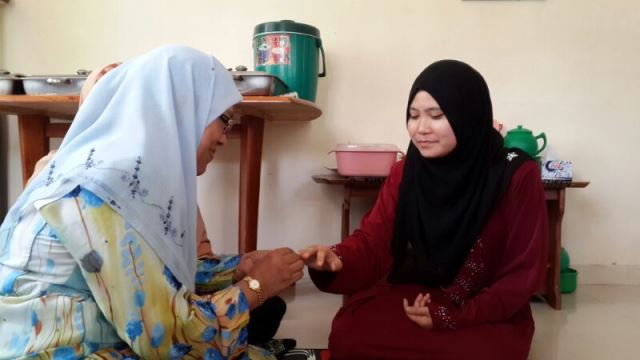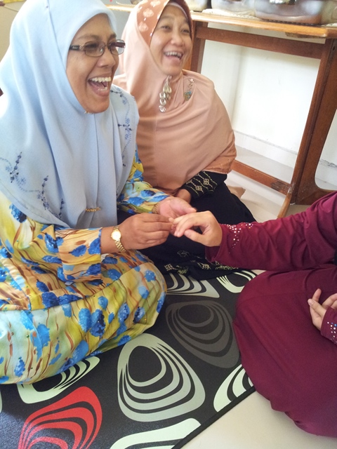 Nik Rosenany sedang menyarung cincin ke jari manis Umu Afifah sedang diperhati oleh Puan Normah (ibuUmu Afifah)
